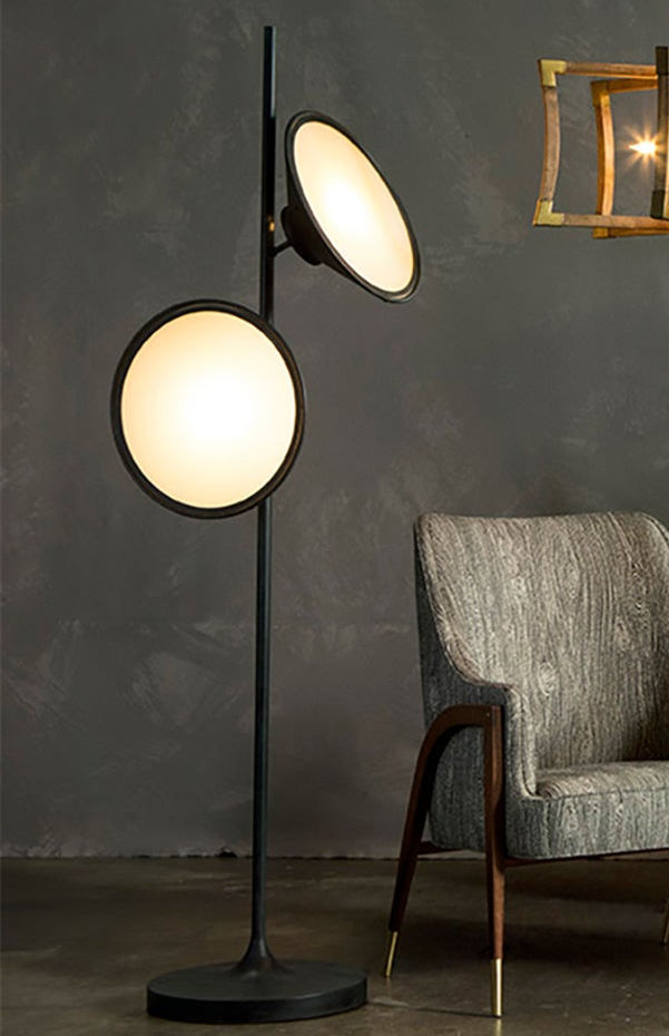 This black floor lamp showcases a matte frosted glass lampshade, perfectly complemented by surrounding metal embellishments